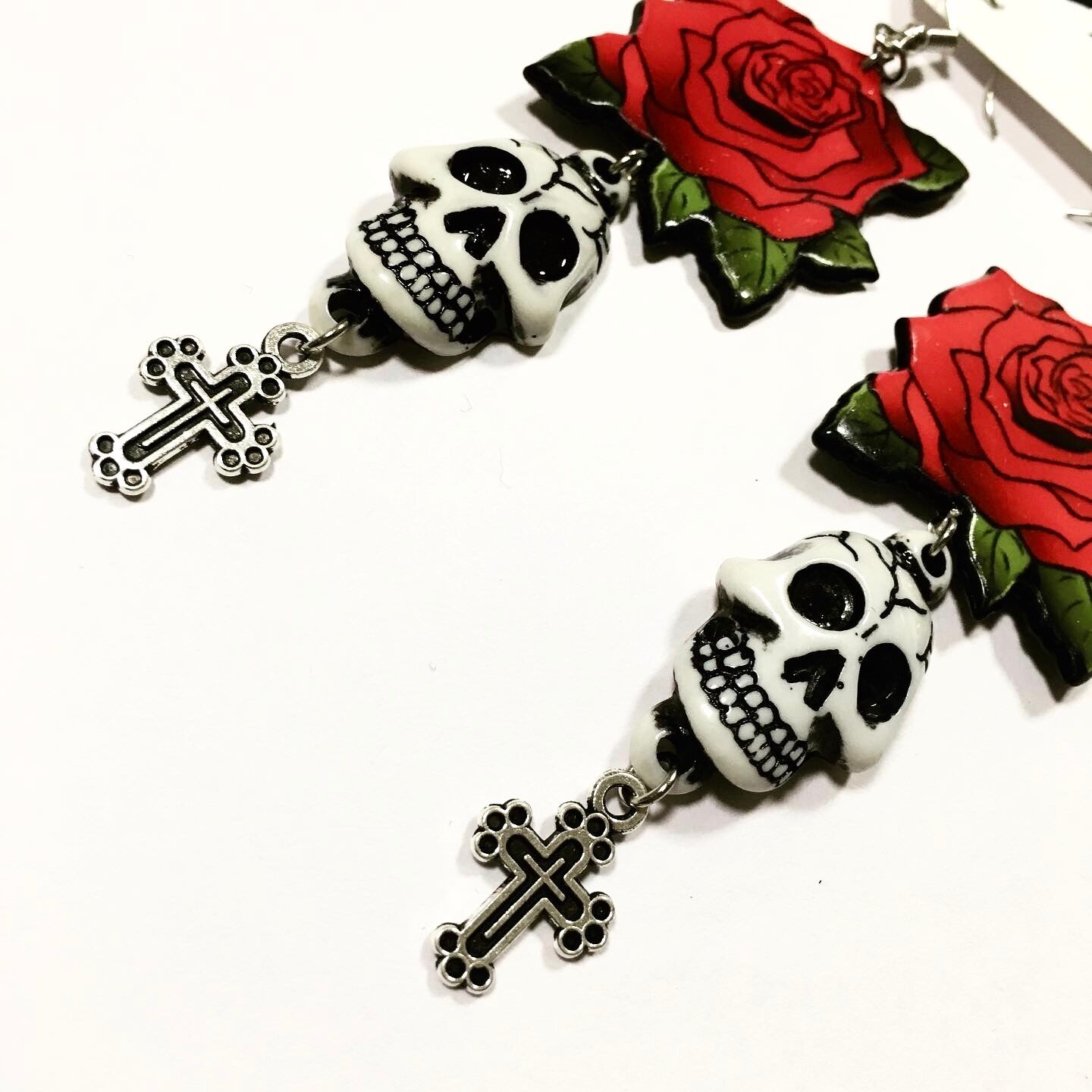 再販【ハーディな薔薇と十字架スカルのピアス イヤリング。】