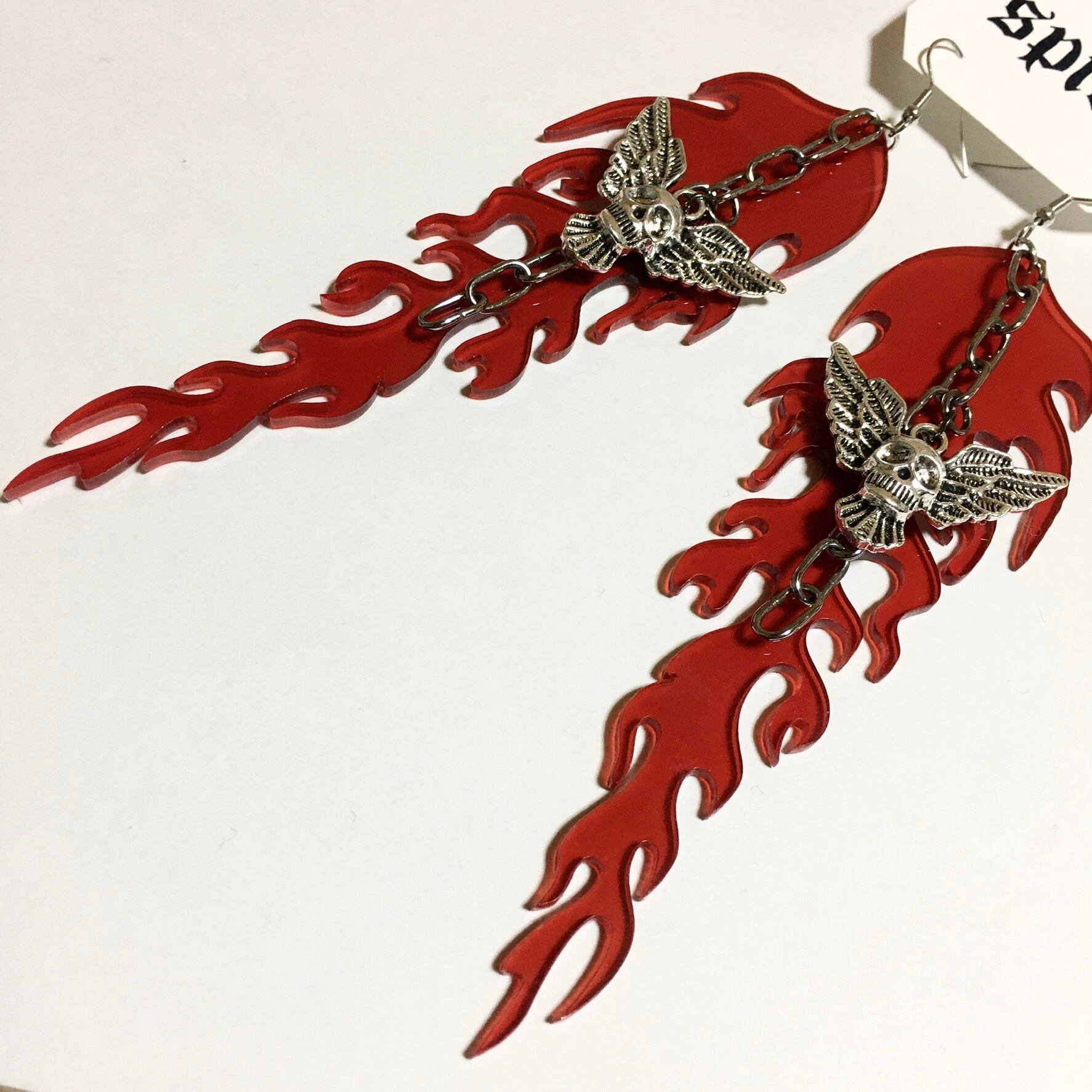再販【燃える炎とエンジェルスカルのロングなピアス イヤリング。】